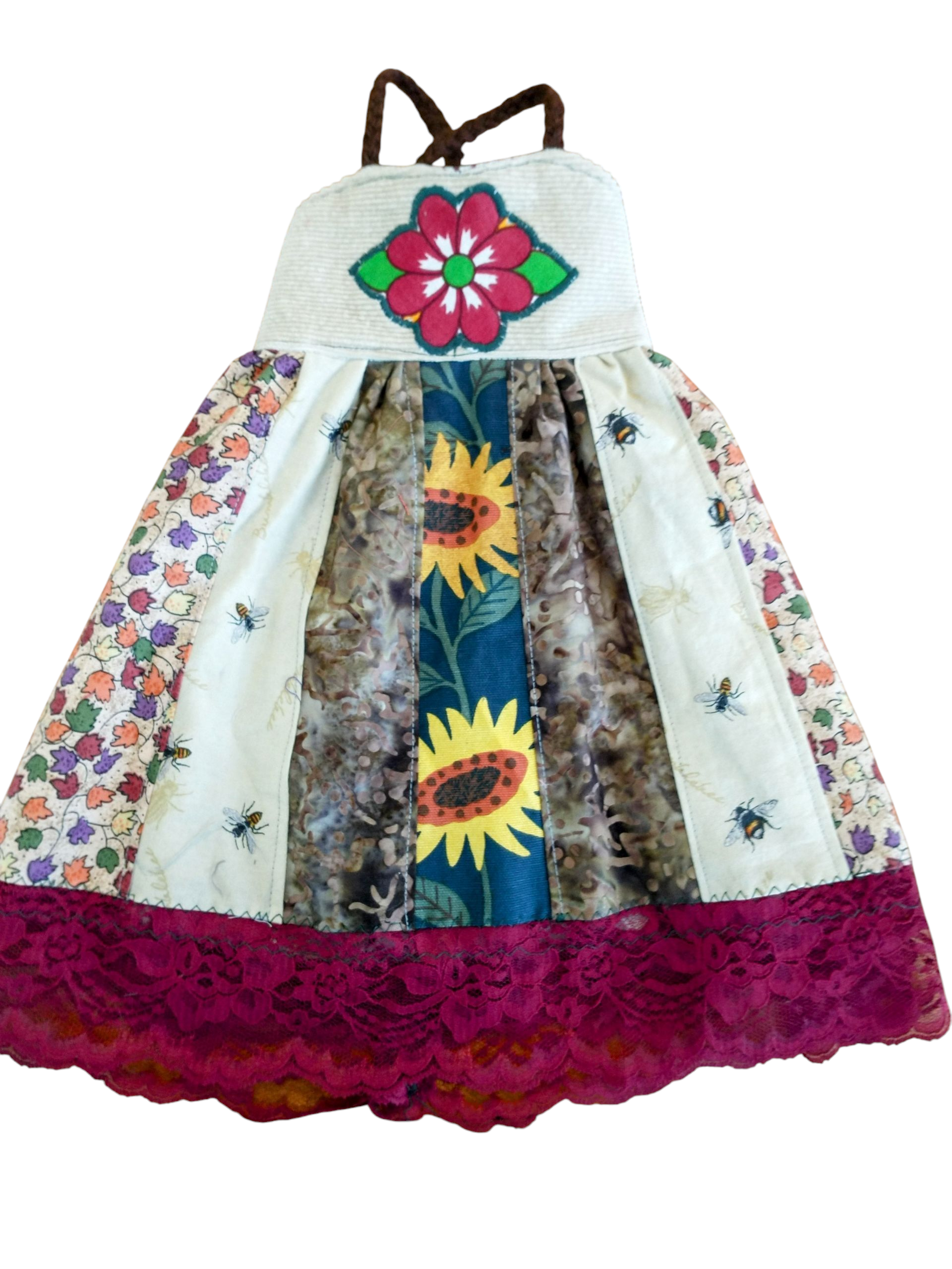 I made this with patchwork of flowers, leaves and bees. Corduroy top with flower applique.