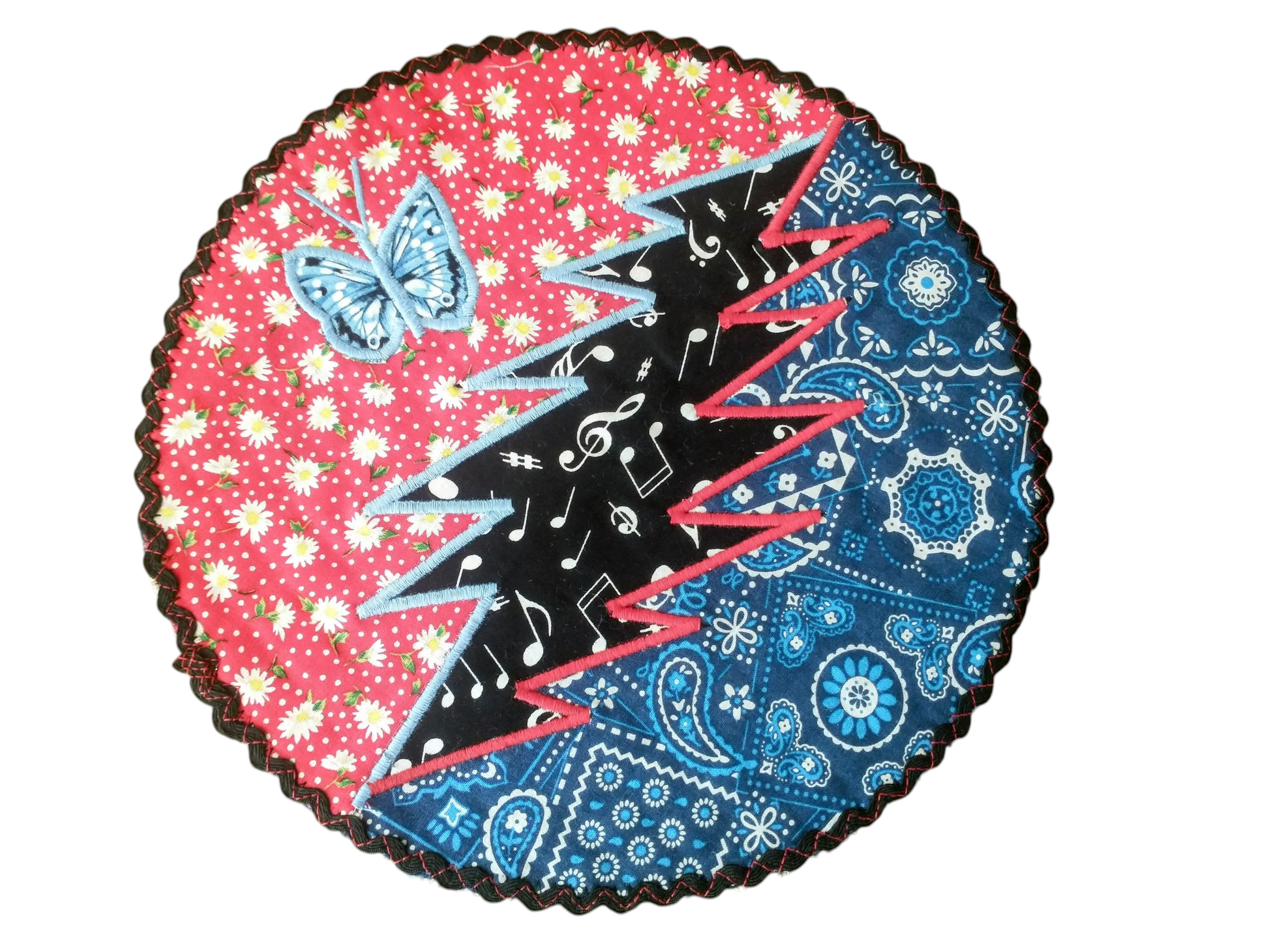 I quilted this with blue bandana cotton, red daisies cotton, music note print and a butterfly applique.