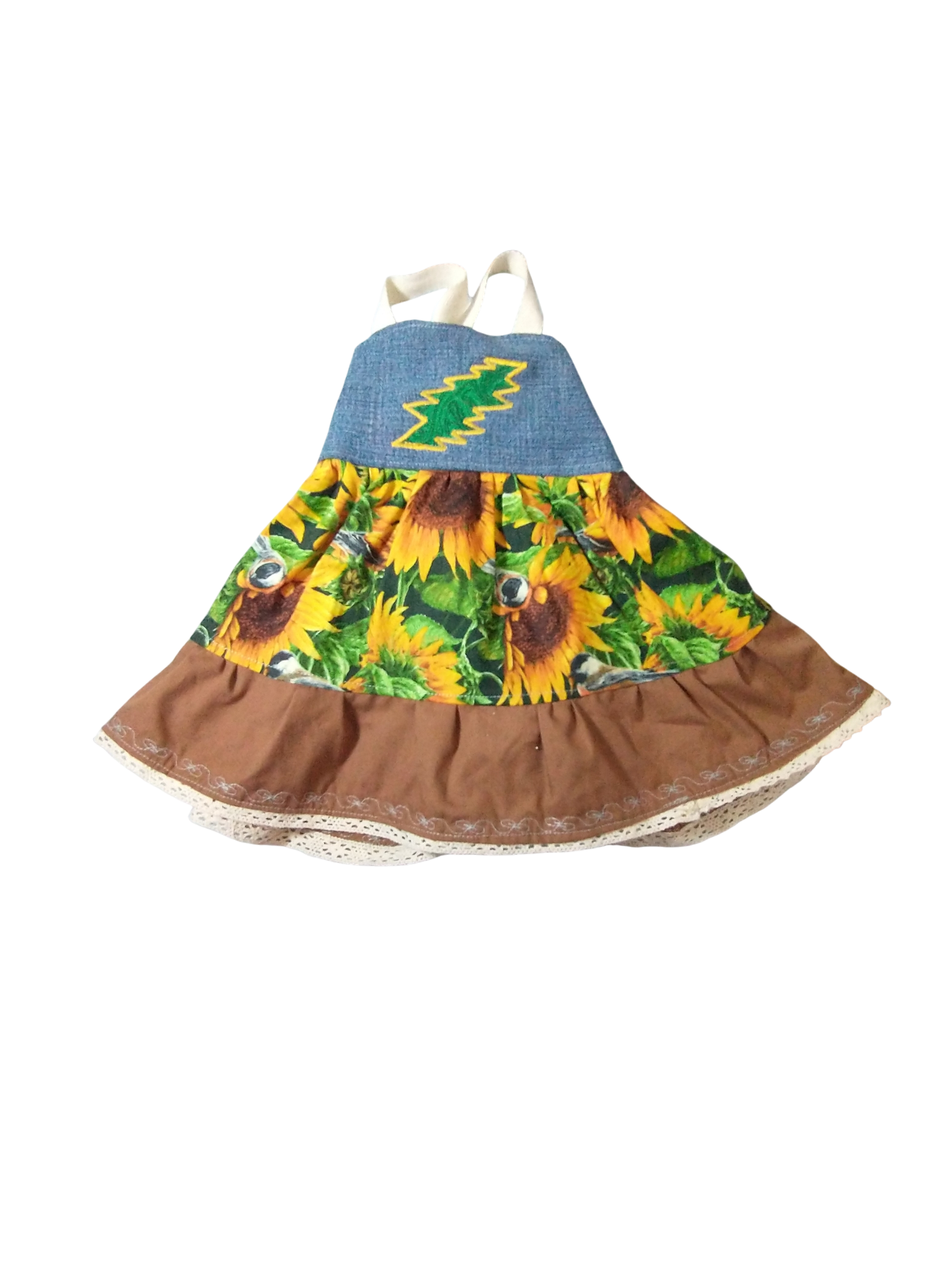 I made this one with pretty birds sunflowers print trimmed with brown cotton lace ruffle cotton and a denim top. Green bolt applique.