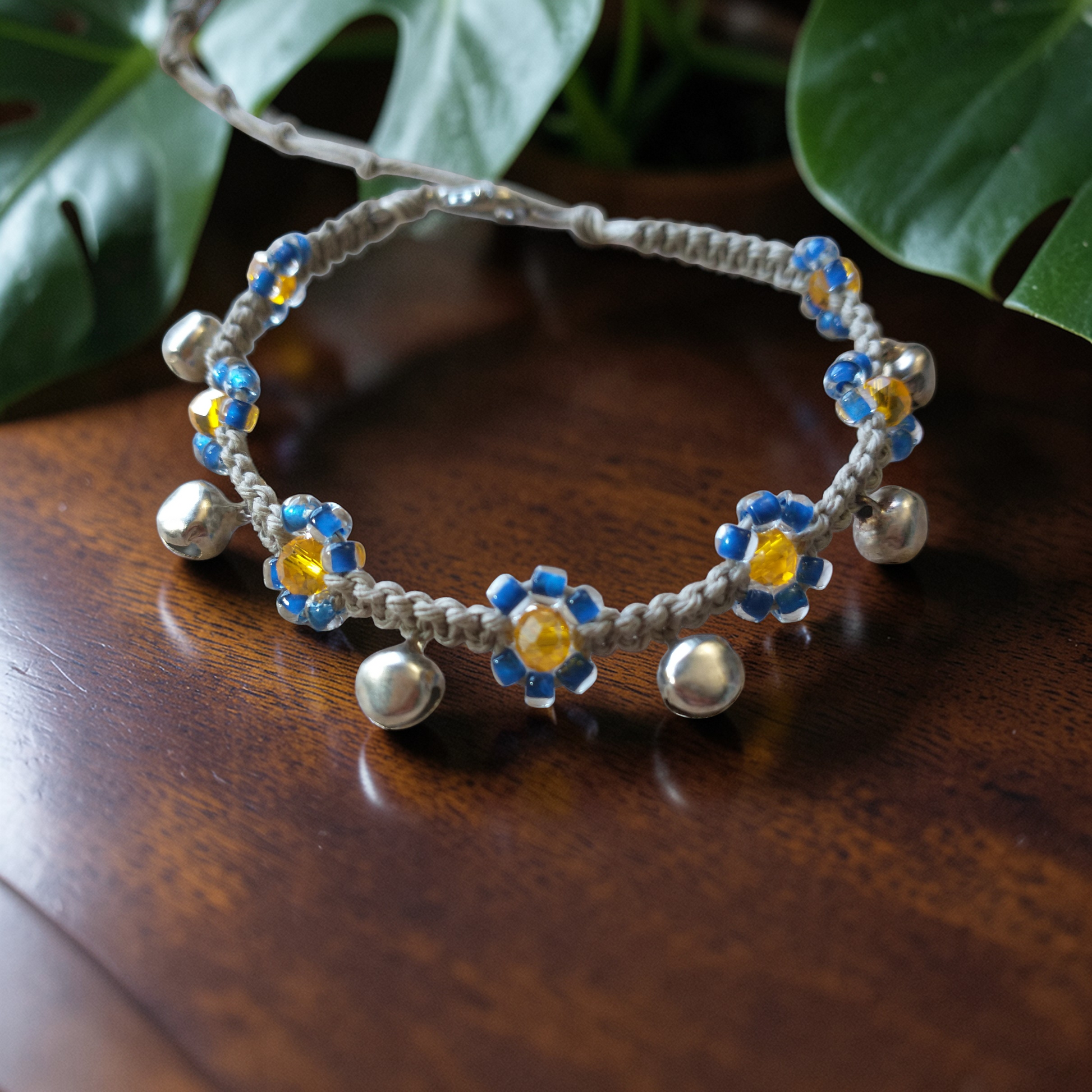 I made this with natural hemp cord, beaded glass flowers and bells.
