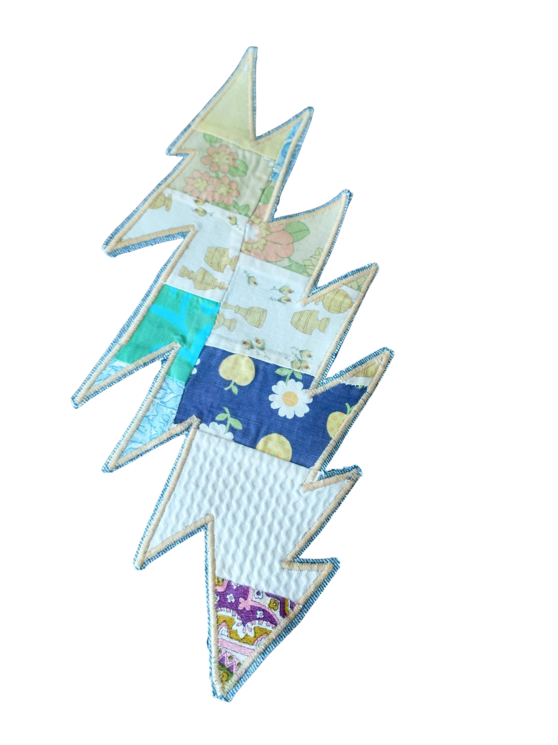 I care this with a patchwork of vintage fabrics. It's a.large patch measurements 16 inches tall by 7 wide.